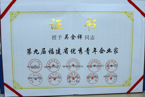 [喜訊] 日前,由共青團福建省委員會、福建省經濟貿易委員會、福建省國有資產監督管理委員會、福建省對外貿易經濟合作廳、福建省科學技術廳、福建省工商行政管理局、福建省國家稅務局、福建省地方稅務局、福建省環境保護局、福建省青年企業家協會共同主辦的“第九屆福建省優秀青年企業家”評選活動揭曉,鷺燕集團董事長兼總裁---吳金祥先生榮獲“福建省優秀青年企業家”榮譽稱號!